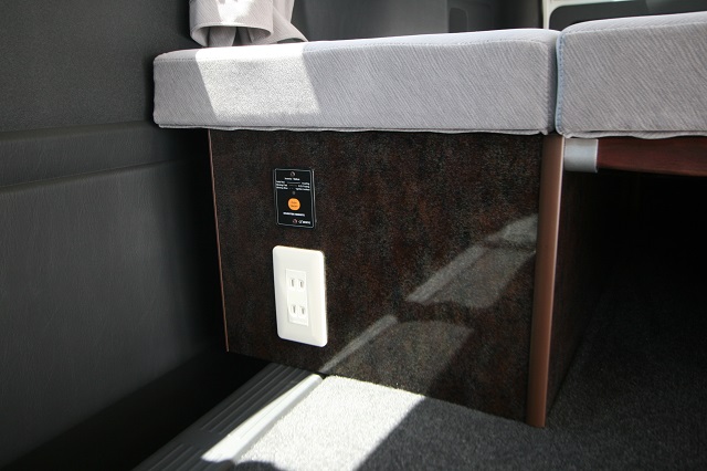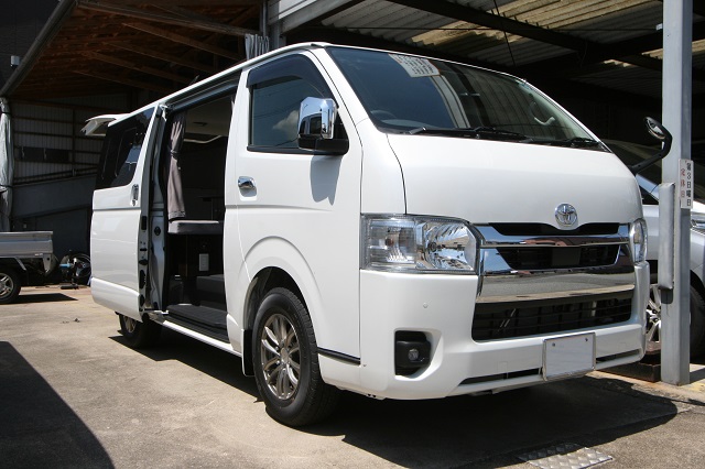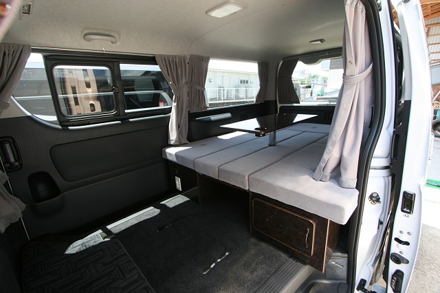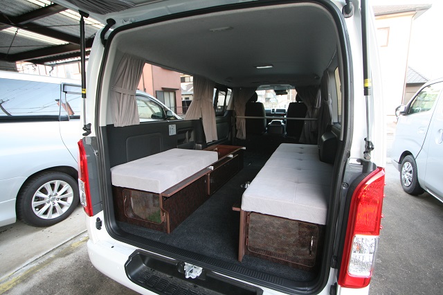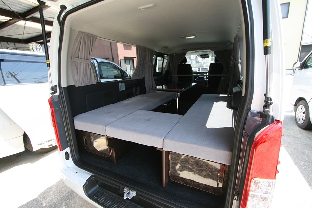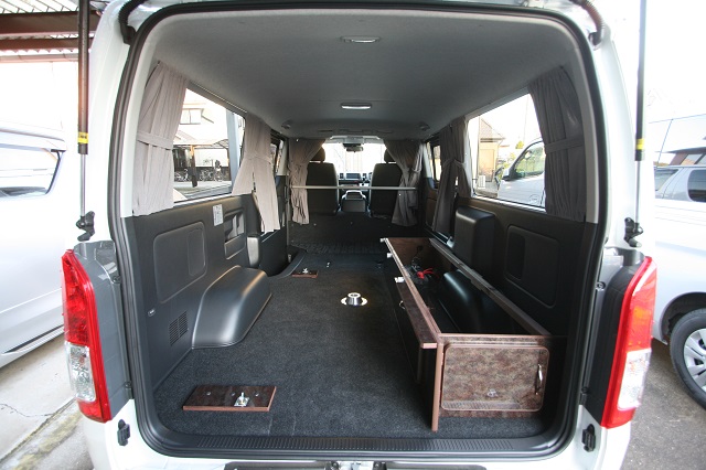 新車のスーパーGLをベースに、まずはセカンドシートを撤去し、乗車定員を2人に構造変更登録。 運転席側後部に走行充電式サブバッテリーシステムとインバータを収めたベースBOXを固定し、 助手席側は脱着式としたベースBOXを取り付け、約1800o×1500oスペースのベッドシステムを製作いたしました。 スイッチとコンセントは全面立壁に配し、シート撤去部分のフリースペースで使用予定の電源を確保しています。 その他全面カーテン、脱着式テーブルも備え、快適車中泊仕様となりました。 この度は誠にありがとうございます。 |
