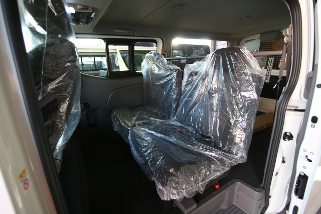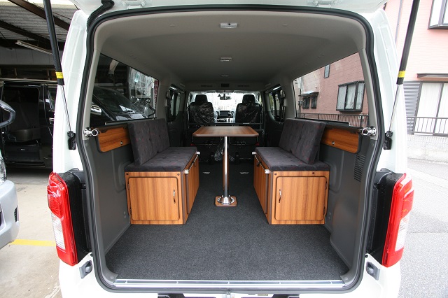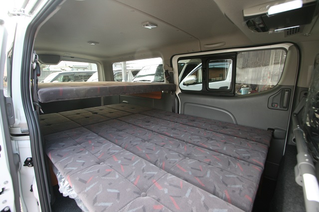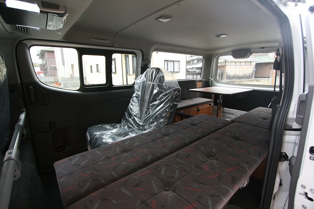 新車のプレミアムGXをベースに、セカンドシート部も利用した二の字対面シ−ト兼フロアベッドシステムと 上段ベッドシステム、脱着式テーブルを装備し、家族5人全員で寝たりテーブルを囲んでくつろげるようにとのご要望に沿って製作させて頂きました。