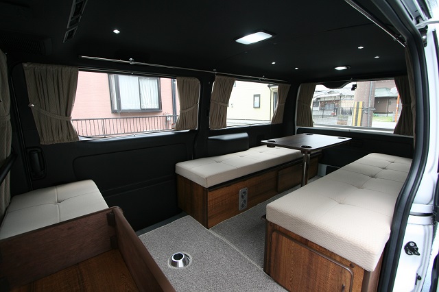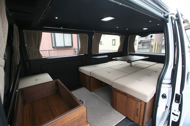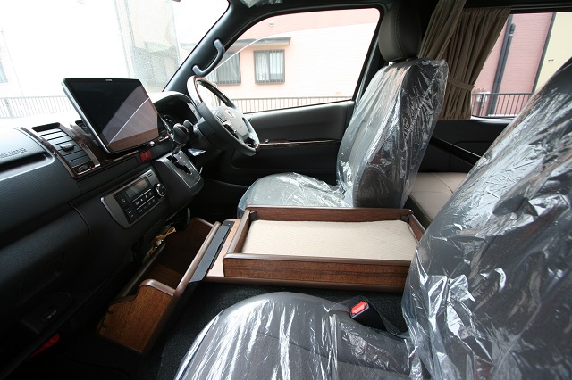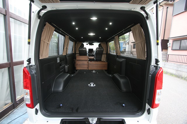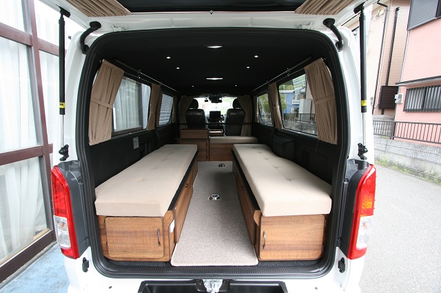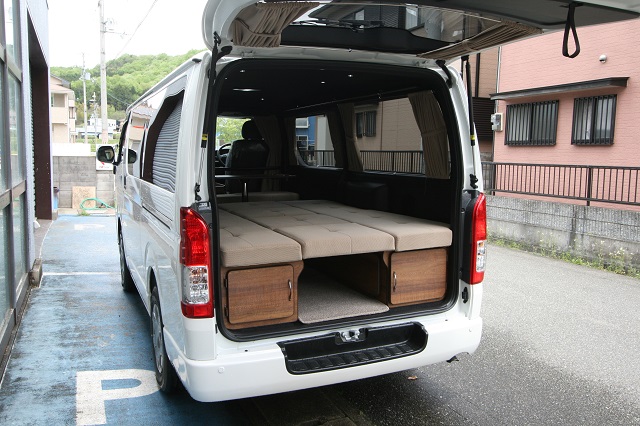 リア脱着式対面二の字シート兼ベッドシステム、元々シートのあったスペースを利用したシューズBOX&傘立て&ベンチシート、そしてフロアジュータンを装備。 脱着式のテーブルはフロント側、リア側共に使用できるようベースを2ヶ所設置しました。 フロントセンターコンソールは純正を撤去し、マット付のワンちゃんスペースを、その前には本棚もあわせて製作させて頂きました。 今まではアルファードでの車中泊でしたが、今後はフルフラットでゆっくり就寝できるこちらのハイエースで思う存分くるま旅を楽しんで頂けたらと思います。 この度は誠にありがとうございます。 |