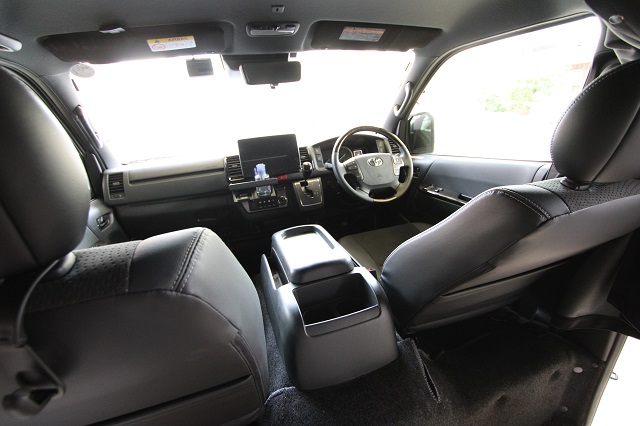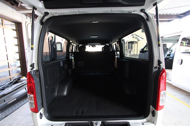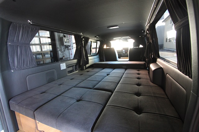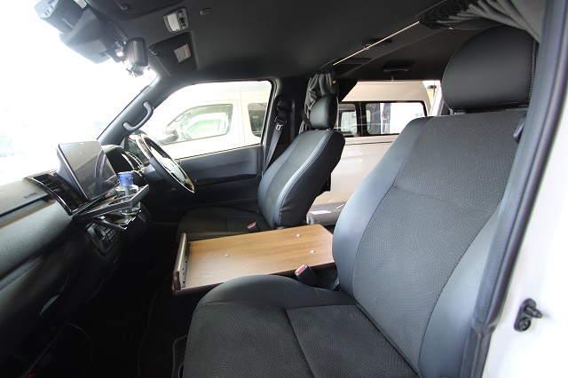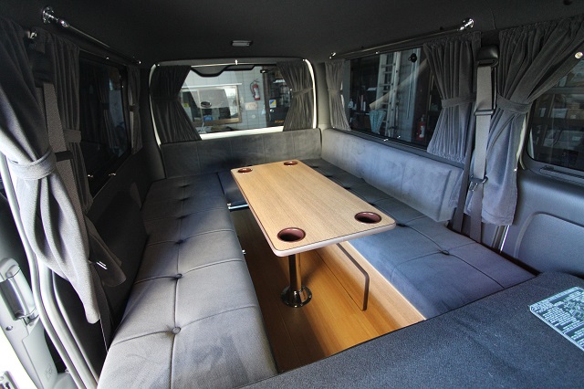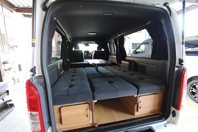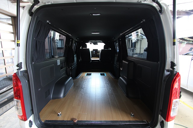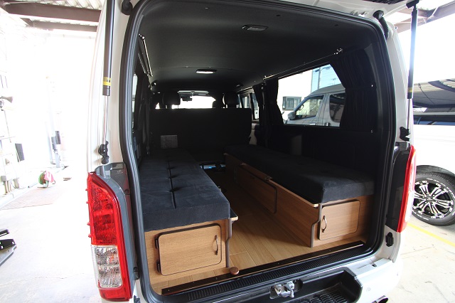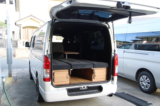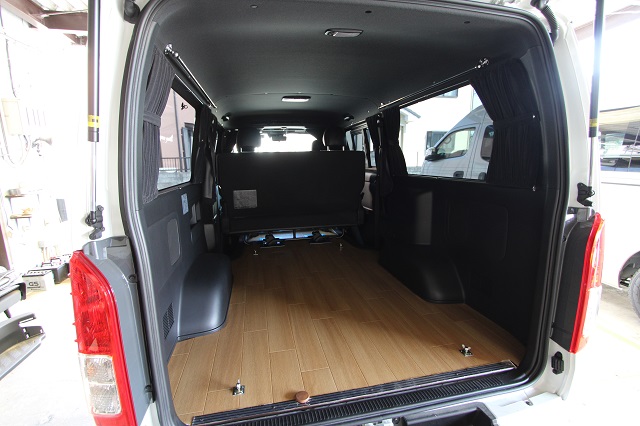 まずは床張りを全面クッションフロア仕上げに。 左右とも脱着式の対面二の字シート兼ベッドシステム、 脱着式テーブル、カーテン一式を製作させていただき、 天井左右にステンレスバー、スライド窓用の網戸も取付させていただきました。 また純正のセンターコンソールは撤去して、 猫ちゃん専用クッションを設置するようフラットベース板も取付しています。 こちらのユーザー様は6年ほど前に製作させて いただいたハイエースユーザー様のご子息で、 親子2代でそれぞれ車中泊をお楽しみいただいてます。 いつもご利用いただき、誠にありがとうございます。 |