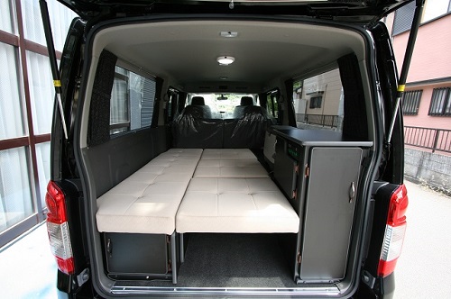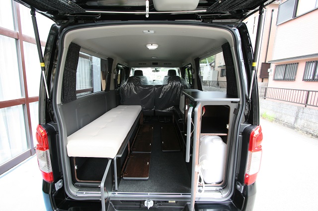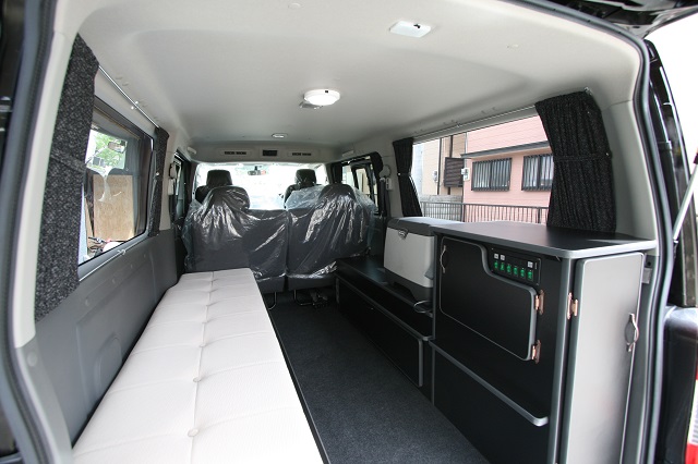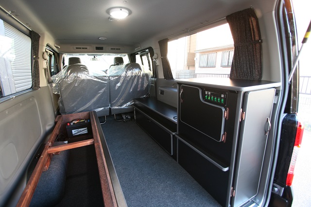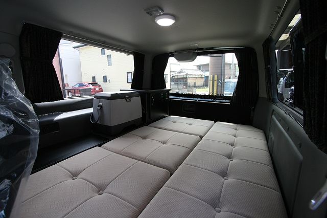 左側に横向きシート兼用の1100o×1800oのスペースを確保したベッドシステムを組み込みました。 またこのベンチシート下に走行充電式サブバッテリーシステムをセットし冷蔵庫、LED照明、シャワーポンプを駆動しています。 その他遮光性を保った全面カーテンと フロント、セカンド足元ジュータン、純正ステレオとETCを取付させて頂きました。 これが初めてのキャンピング仕様車。ステップアップの構想もしつつどんどん活用して頂けそうです。この度は誠にありがとうございます。 |