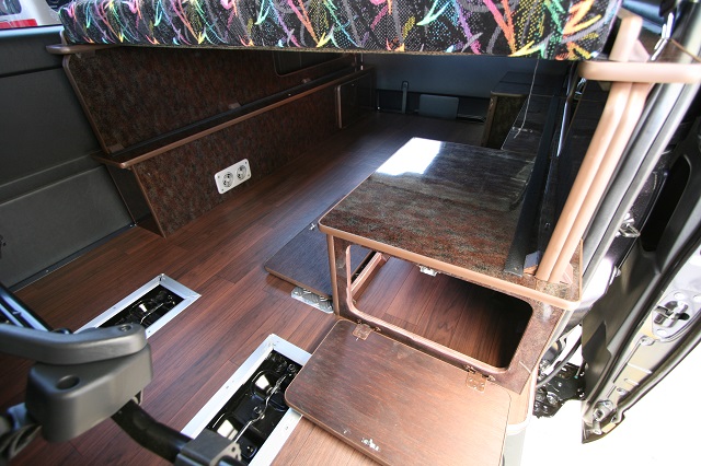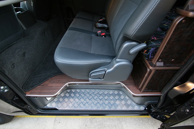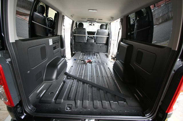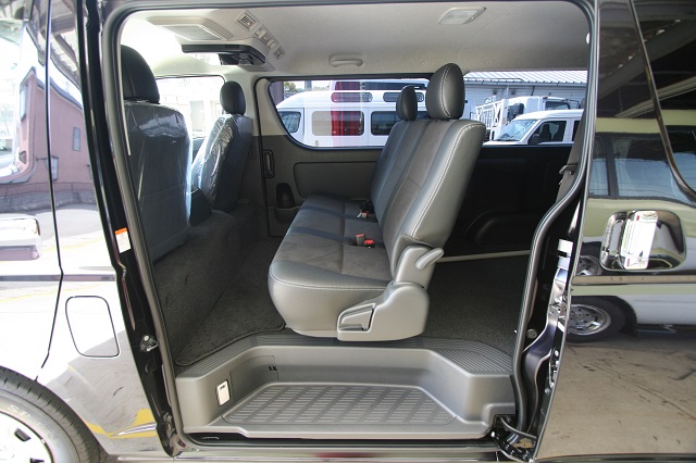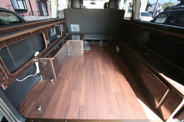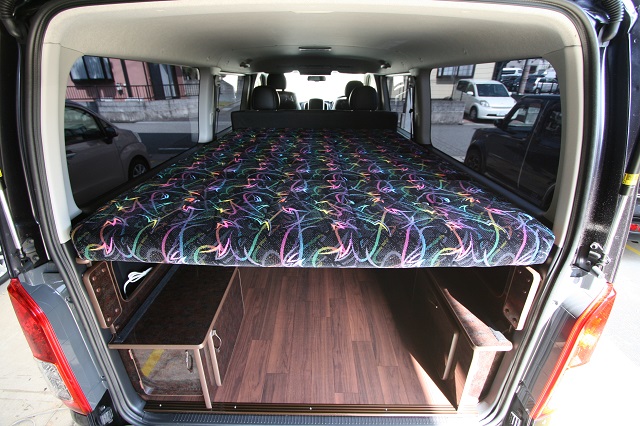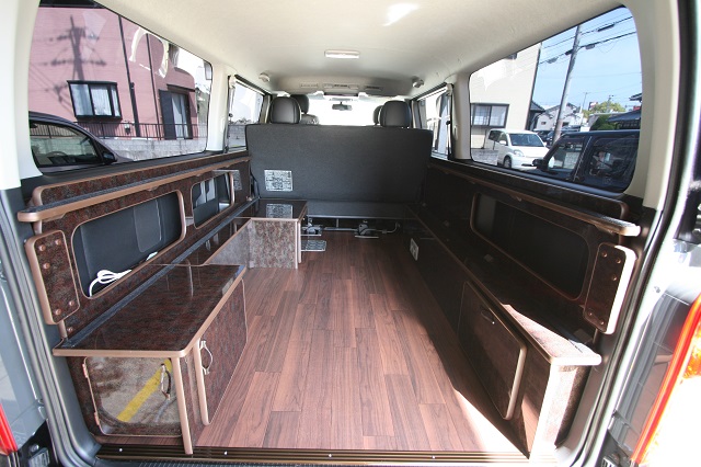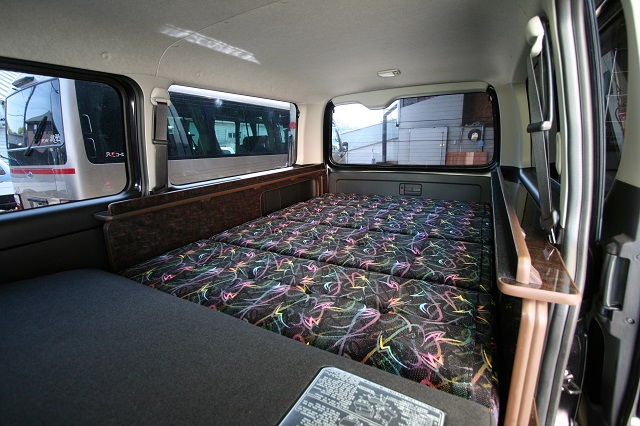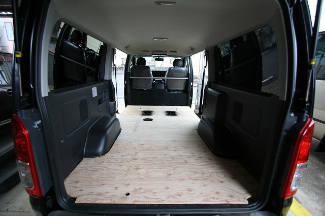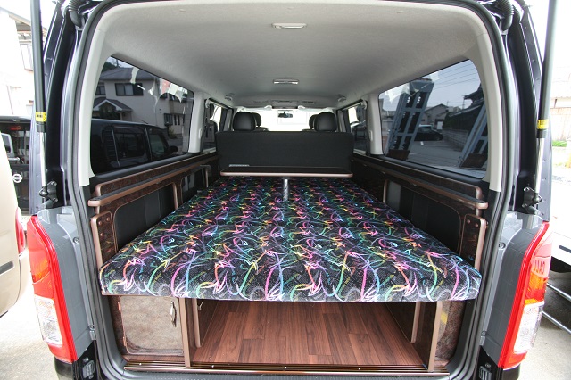ハイエーススーパーGLベース。 新車のダークプライムエディションをベースに全面クッションフロア仕上げの床張、リアには脱着式のテーブルを囲んで寛いだり、 荷物の多いとき収納スペースを確保しつつ就寝出来たりと、用途に応じて高さを上下で変えられる脱着式のベッドシステムを製作させて頂きました。